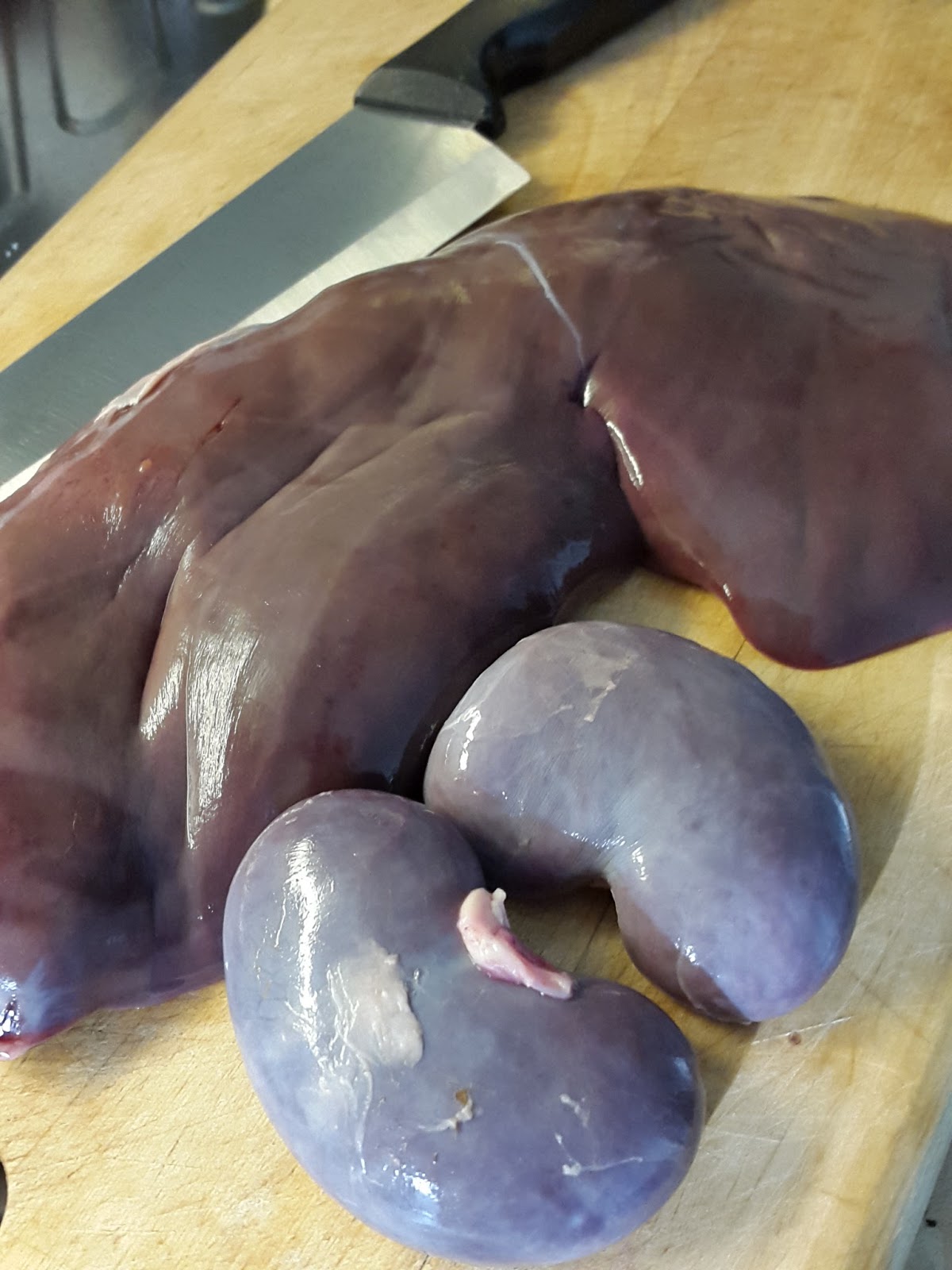 Sain kotiin tuliaisiksi teurastetun karitsan munuaiset ja maksan. Olisin saanut kiveksetkin, mutta niiden valmistusta en oppinut Helsingin työväenopiston sisäelinten valmistus -kurssilla, jolla pääsin tutustumaan minulle uusien siselinten käsittelyyn marraskuussa 2015. Kivekset menivät parempiin suihin eli ystävieni koirille.